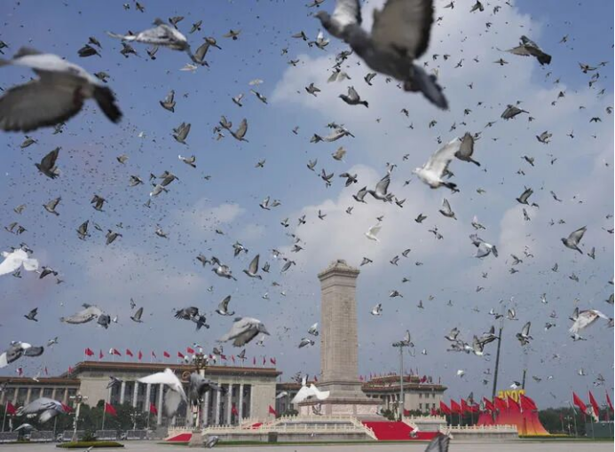 80响礼炮震彻云霄、8万羽和平鸽振翅飞翔,“正义必胜!和平必胜!人民必胜!”的昂扬之声久久回荡。
