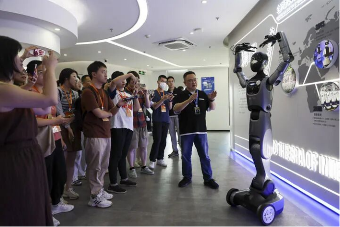 2025年9月12日,“活力中国调研行”采访团成员在上海擎朗智能科技有限公司观看人形机器人表演。新华社记者 王翔 摄