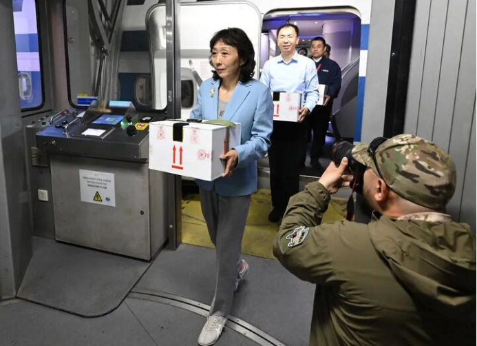 2025年5月18日,护送文物归国的工作人员手捧装载着子弹库帛书的保护箱走出客机。新华社记者 李贺 摄