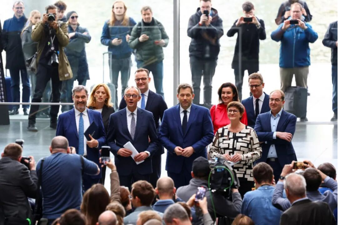2025年4月9日,由默茨(前排左二)领导的德国联盟党与社民党举行新闻发布会,公布联合执政协议。