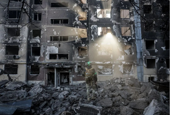 2025年11月16日,乌克兰武装部队第24机械化旅的军人在乌东顿涅茨克康斯坦丁诺夫卡市的废墟中巡逻。